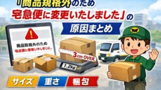 「商品規格外のため宅急便に変更いたしました」と表示される原因を解説。サイズ・重さ・梱包ミスなど、ネコポスや宅配便コンパクトで規格外になる具体例と対策をまとめました。
