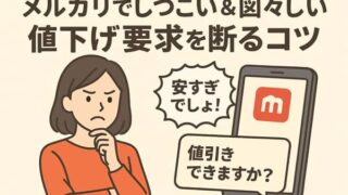 顧客対応 メルカリでしつこい&図々しい値下げ要求を断るコツ 「メルカリでしつこい&図々しい値下げ交渉」に困っている出品者必見。感情的にならずに断るコツや、放置・ブロックの判断基準、スマートな断り方を解説します。 2025.10.01 顧客対応